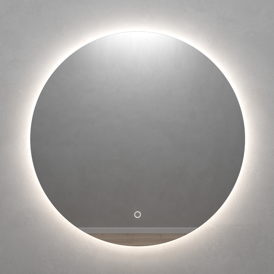 Безрамное зеркало круглой формы с контурной (тыльной) нейтральной подсветкой, свет 4000К. Подложка из высококачественного МДФ, светодиодная лента защищена матовым свето-рассеивателем от попадания пыли и влаги. Есть вывод 220W для подключения к сети, включение подсветки от сенсорной кнопки на зеркале.